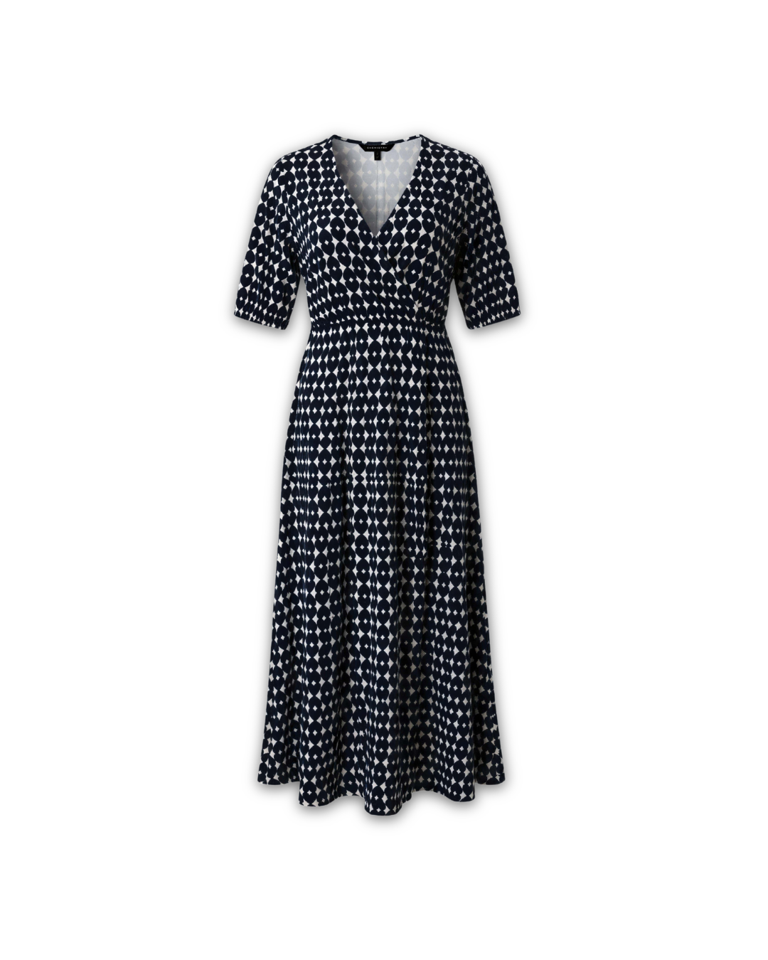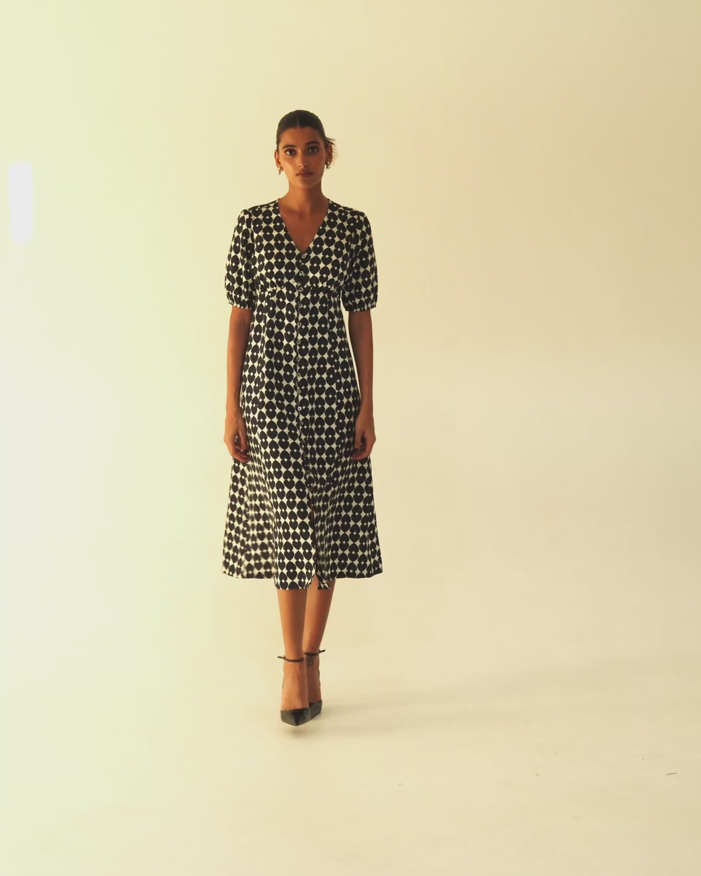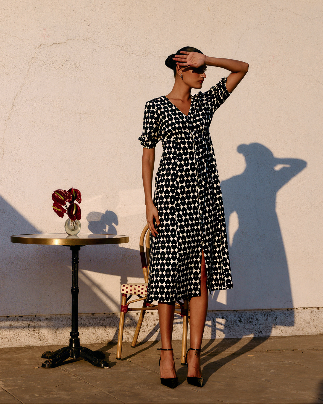 A shin-length dress from the Flipped Heart print story, designed with enduring appeal. Fully front-opening with above-elbow sleeves and a clean V neckline. The high basque defines the waist with a precise, flattering fit. Crafted in a textured viscose blend, it is a modern classic designed for repeated wear.