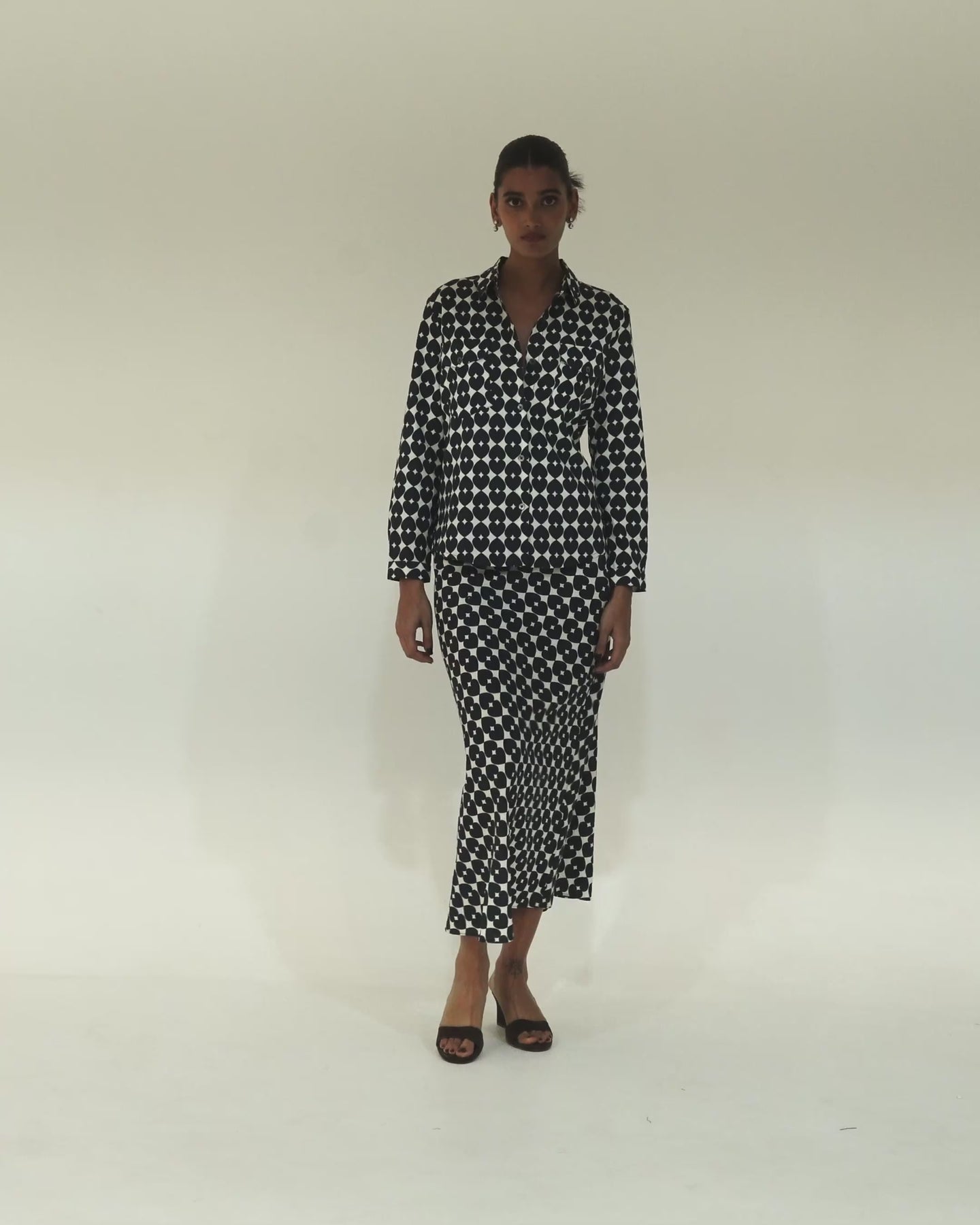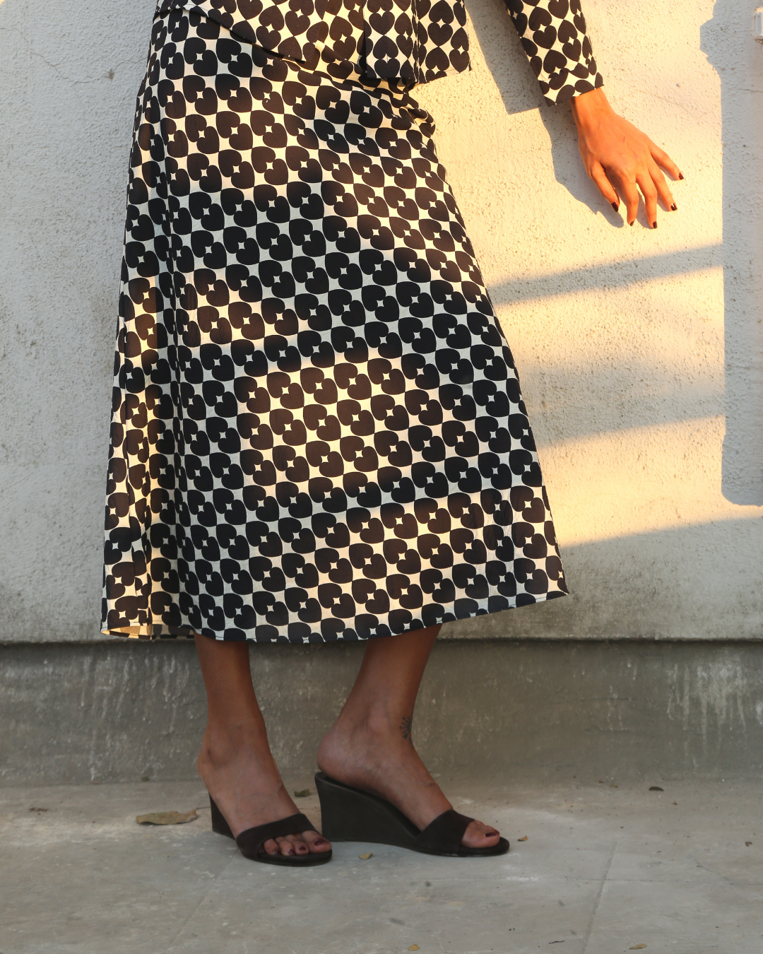 A bias-cut skirt from the Flipped Heart print story, designed with fluid precision. Superbly fitted through the waist and hip before falling to a low-shin length. Crafted in a textured viscose blend that enhances movement and drape. A refined silhouette that balances softness with structure.