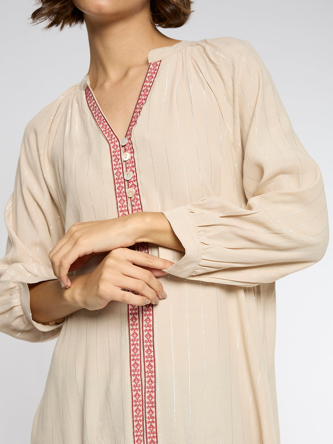 A long-line tunic with refined structure and fluid movement. Cut in rayon crepe with a clean V neckline and three-quarter sleeves. A full panel of intricate embroidery defines the centre front with understated elegance. Long side slits elongate the silhouette, creating ease and quiet drama.