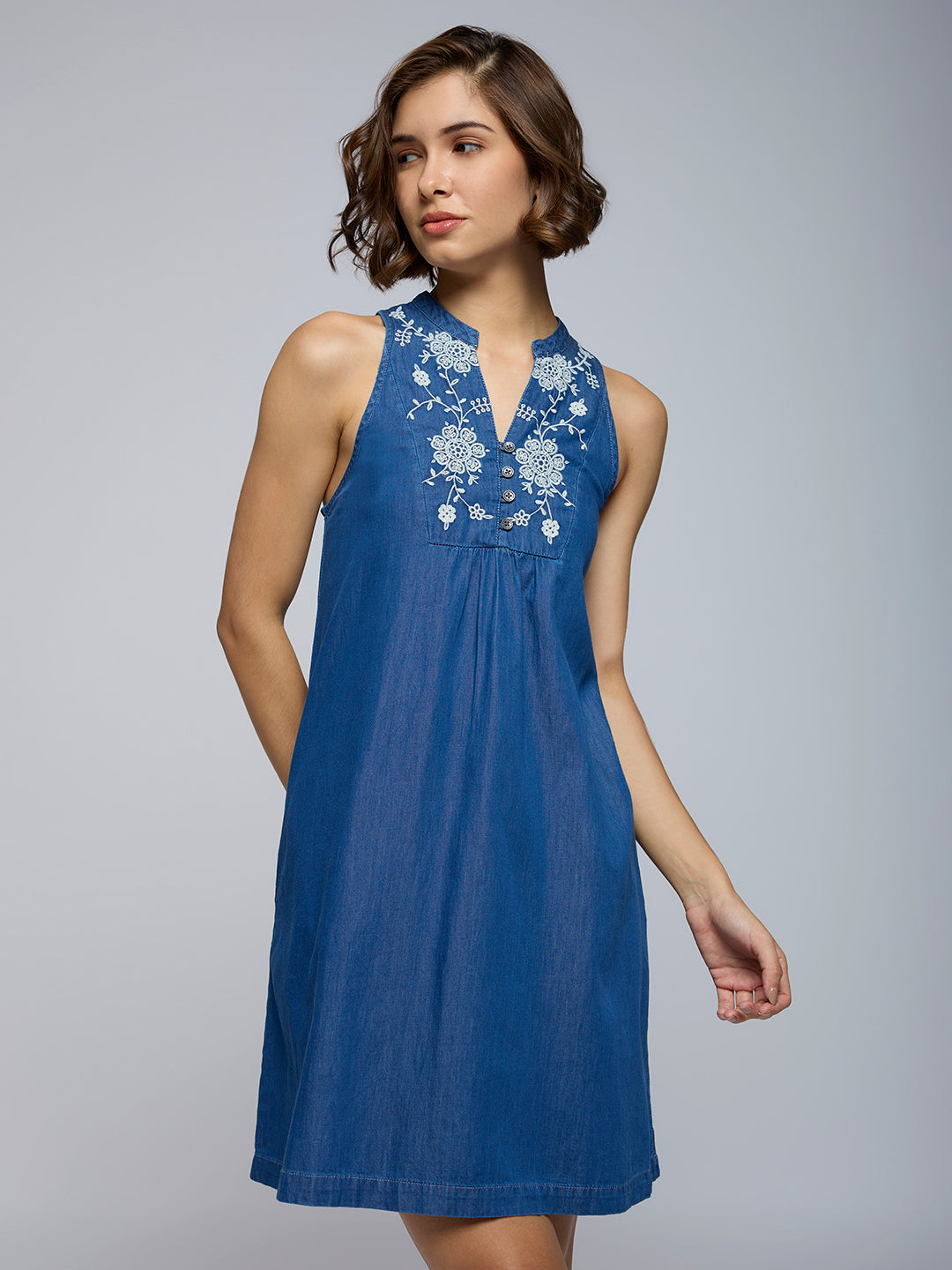 CRUSHED VISCOSE EMBROIDERED TIERED DRESS
