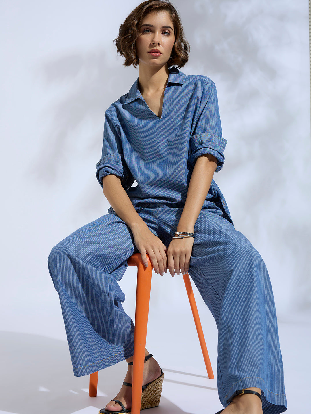 STRIPED DENIM POP OVER TUNIC & PANTS CO-ORD SET